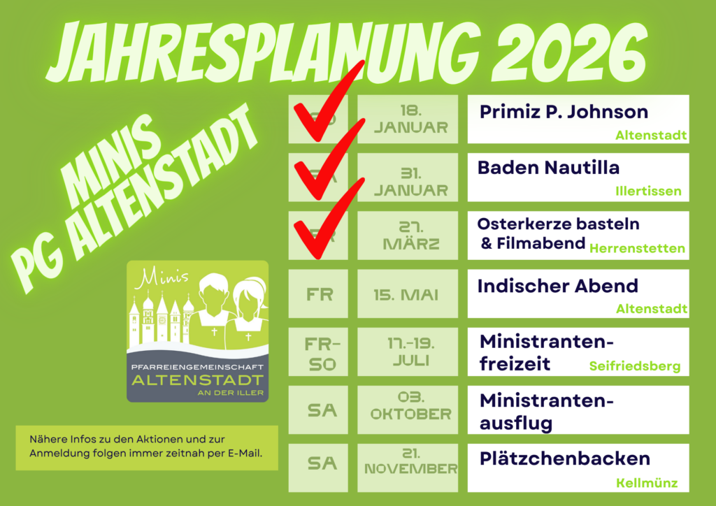 15. Mai 2026 – indischer Abend Hier finden Sie die Anmeldung zum indischen Abend mit Pater Johnson im Pfarrheim Altenstadt – Anmeldeschluss 10.05.2026 17.-19.07.2026 – Ministrantenfreizeit Hier finden Sie die Anmeldung zur Ministrantenfreizeit in Seifriedsberg – Anmeldeschluss 07.06.2026