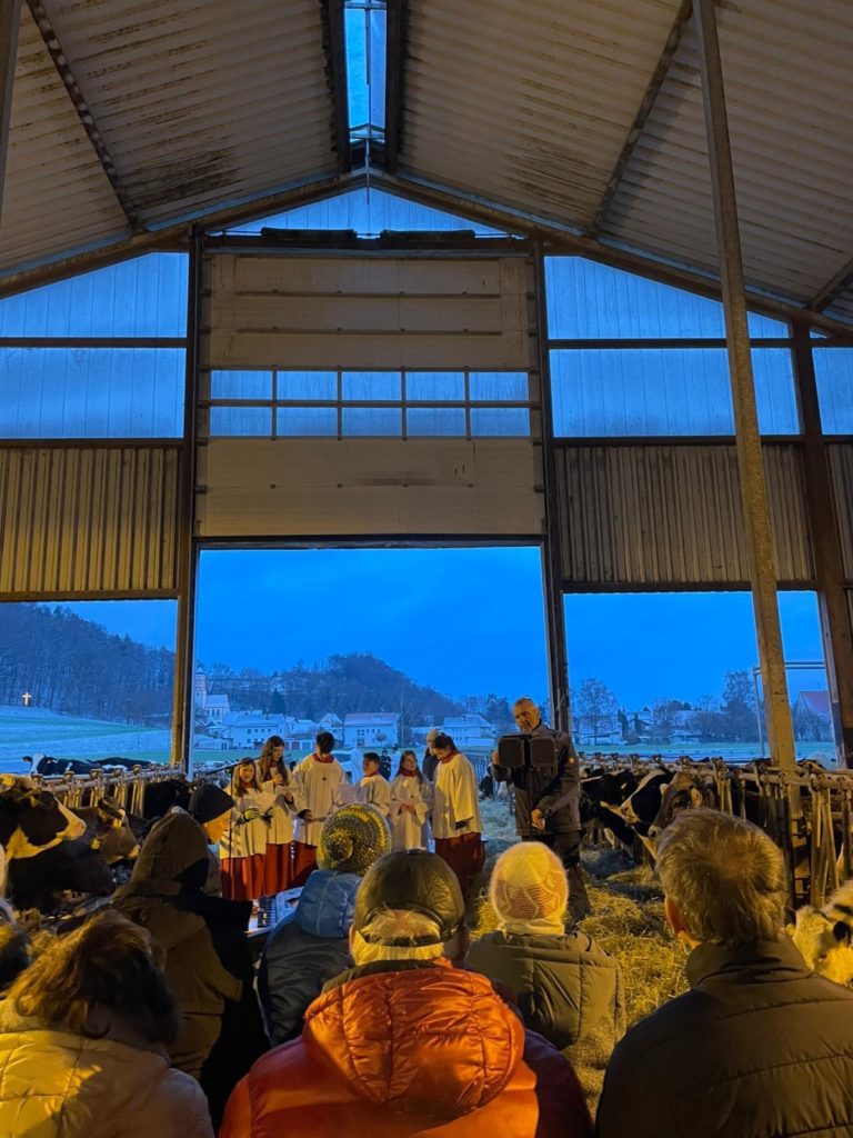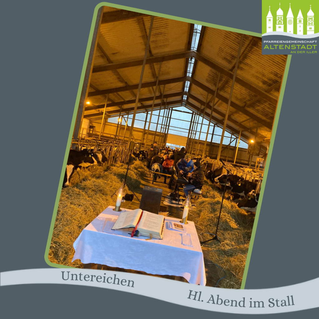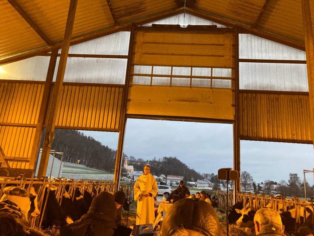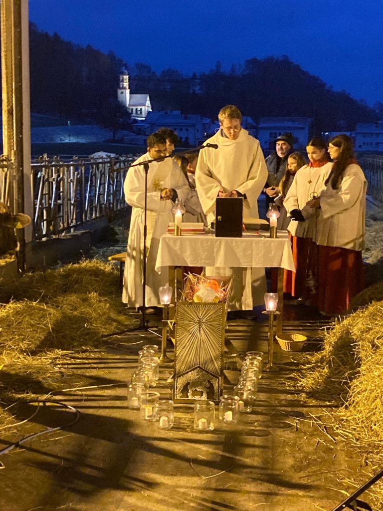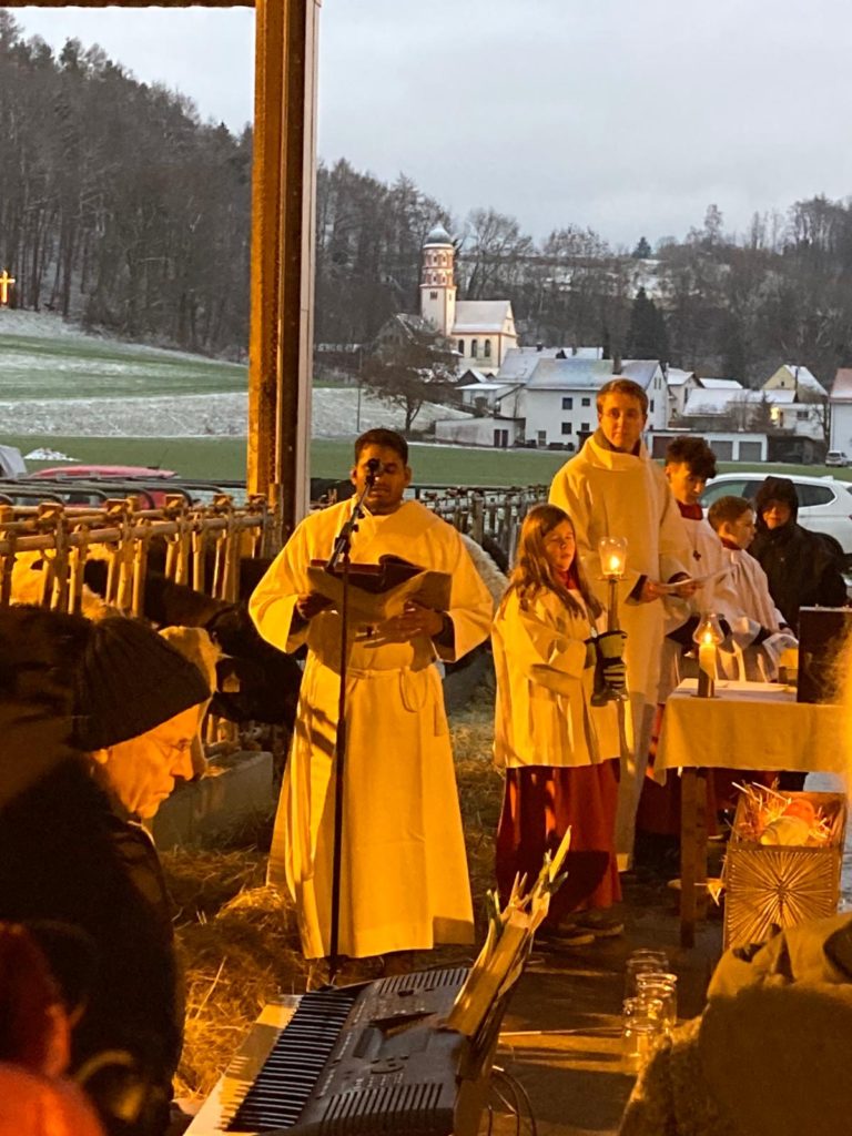 Man kann sagen die Reihe „Gottes Wort an ungewöhnlichen Orten“ fand an Hl. Abend im Stall vom Zankerhof in Untereichen seine Fortsetzung. Vor dem Wortgottesdienst mit Kommunion schauten die Ministranten auf die verschiedenen Sichtweisen von Maria, Josef, der Hirten und einem Engel auf die Geburt Jesu. Feierlich wurde die Wortgottesfeier von Diakon Frater Johnson und Jakob Russwurm, Pastoralpraktikant gestaltet und von Klaus Fischer musikalisch umrahmt. Mit Blick auf die hell erleuchtete Pfarrkirche St. Peter und Paul und das Osterkreuz stimmten die zahlreichen Besucher am Schluss in „Stille Nacht“ ein.
