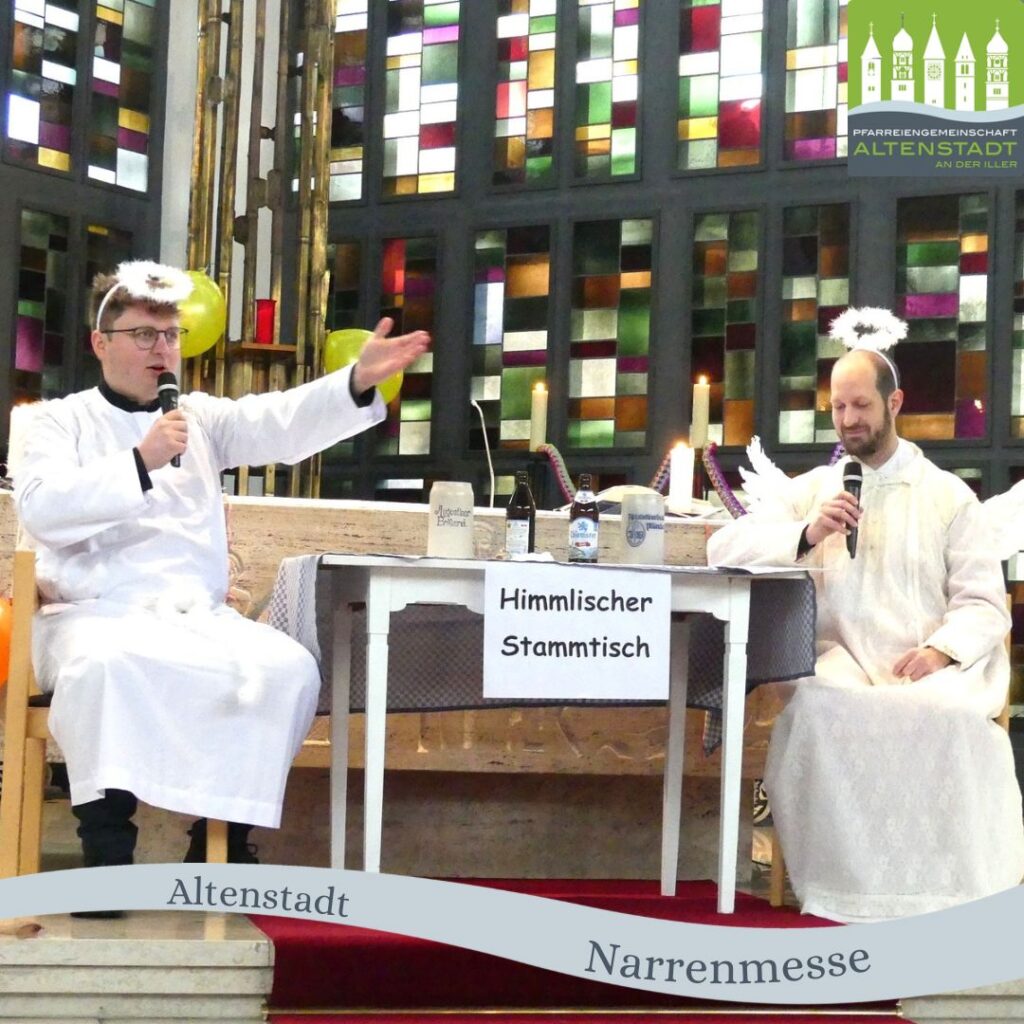 Fröhlich-bunt gings zu bei der Narrenmesse. Die BläachGugga Fätzzer.sorgten dabei für ausgelassene Stimmung, die Dancing Kids für ihren Darbietungen ebenfalls für viel Applaus. Es wurde geschunkelt und bei manchen auch ausgelassen getanzt. Eine Polonaise zog ihre Kreise durch das Gotteshaus. Dieses war vollbesetzt mit Närrinnen und Narren, die alle der Einladung des Familiengottesdienstteams der PG und der Faschingsfreunde Altenstadt gefolgt waren. Und es gab auch „himmlischen Besuch“. Faschingsmäßig verwandelt traten unser Pfarrer Thomas Kleinle und Altenstadts Zweiter Bürgermeister Konstantin Zanker als „Petrus“ und „Paulus“ beim „Himmlischen Stammtisch“ auf. Rund um ihre „Schäfchen“ aus Altenstadt gönnten sie sich bei scheinbar vollen Krügen Bier einen ausgedehnten Schlagabtausch. MitWitz und trockenem Humor wurde dabei vom ZDF-Gottesdient bis hin zu den Müllgebühren, vom Aufforsten vom Gewerbegebiet bis hin zum Osterberger Turmschnaps so einiges auf die Schippe genommen.