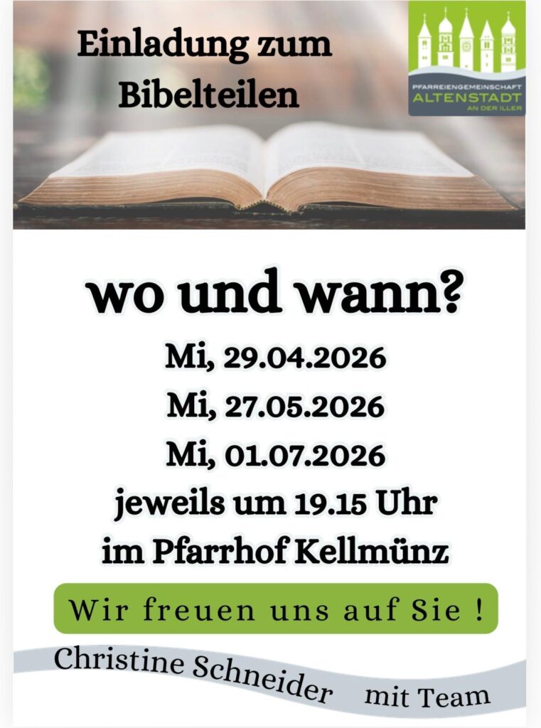 Einladung zum Bibelteilen Veröffentlicht am 17. April 202617. April 2026 von Lena Ziesche am Mittwoch, 29.04.2026, Mittwoch, 27.05.2026 und Mittwoch, 01.07.2026, jeweils um 19:15 Uhr im Pfarrhof Kellmünz.
