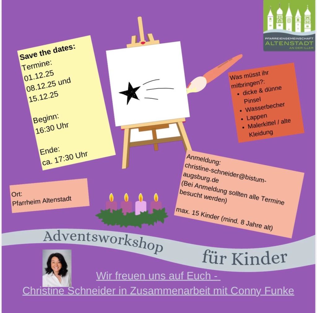 Herzliche Einladung zum Adventsworkshop für Kinder im Pfarrheim Altenstadt Veröffentlicht am 3. November 20253. November 2025 von Lena Ziesche Termine: 01.12.25, 08.12.25 und 15.12.25Beginn jeweils um 16:30 UhrAnmeldung unter christine-schneider@bistum-augsburg.de